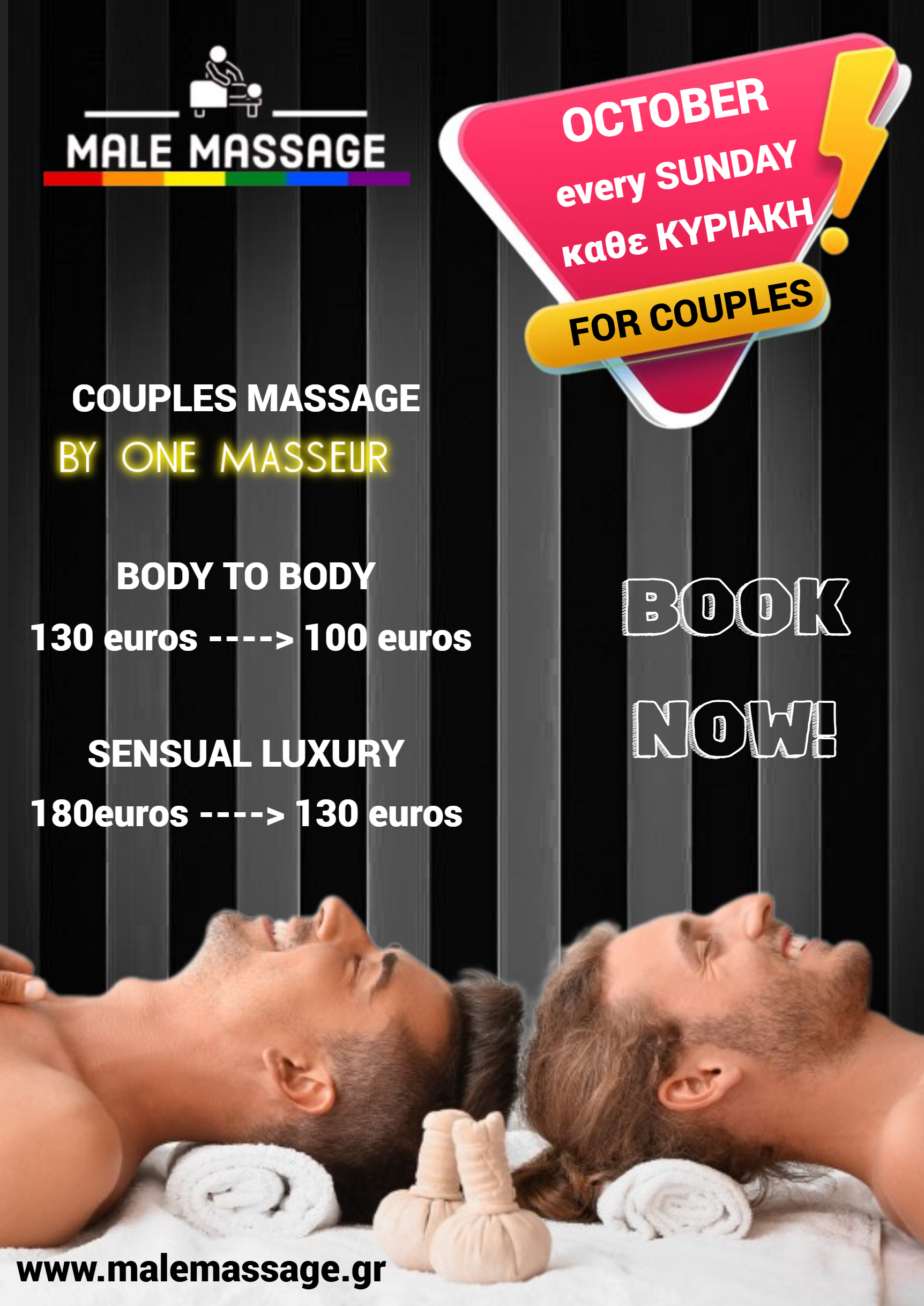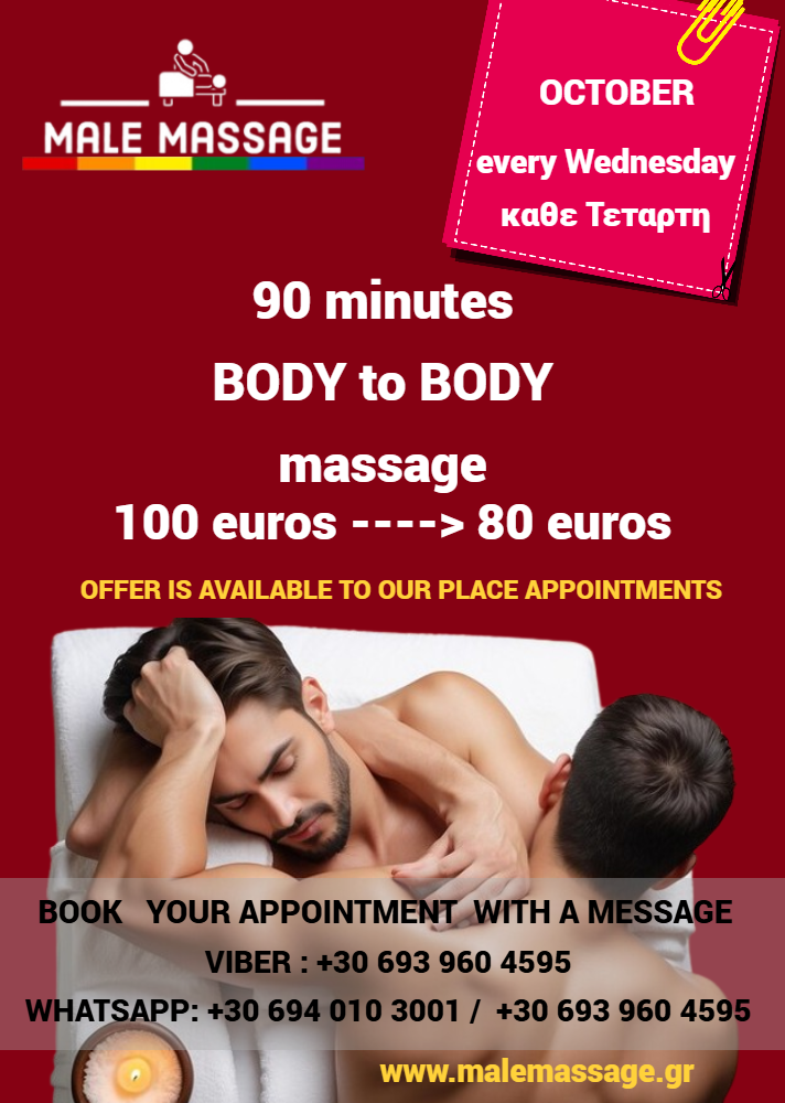 Χάρισε στον ευατό σου την εμπειρία ενός πραγματικά καλού male μασάζ. Δώσε στον εαυτό σου ένα διάλειμμα, αφιέρωσε χρόνο για ένα μασάζ, για να χαλαρώσεις, να αφεθείς, να απολαύσεις· χρόνο για μια συναρπαστική περιπέτεια.